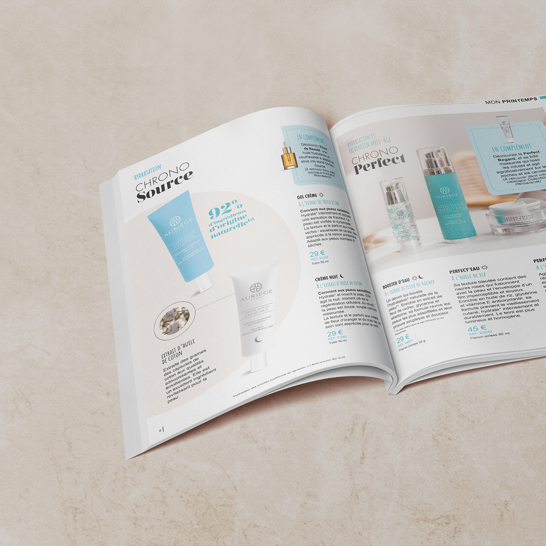 Ce projet s’inscrit comme la continuité directe du travail photographique réalisé en amont pour la marque Auriège Paris. Les catalogues saisonniers constituent l’aboutissement visuel de cette démarche, en mettant en situation les produits à travers une approche éditoriale soignée et cohérente avec l’image haut de gamme de la marque. Auriège Paris, institut de beauté spécialisé dans les produits solaires, les cosmétiques et le maquillage premium, édite chaque année deux catalogues — Printemps–Été et Automne–Hiver — destinés à présenter ses collections permanentes et saisonnières. J’ai participé à la mise en page complète des catalogues, au maquettage des produits ainsi qu’à la retouche et à l’optimisation des visuels, afin de garantir une lecture fluide et une mise en valeur précise de chaque référence. Le projet a nécessité un travail minutieux sur l’équilibre entre texte, images et espaces, dans le respect des codes graphiques de la marque. Les photographies issues du shooting produit ont été intégrées comme éléments centraux de la narration visuelle, renforçant l’identité de chaque collection et la perception qualitative de l’offre. Pensés pour une diffusion annuelle à des moments clés de l’année, ces catalogues sont conçus comme de véritables supports éditoriaux, à la fois informatifs et esthétiques, destinés à accompagner la stratégie commerciale et l’image de marque d’Auriège Paris sur ses supports print.